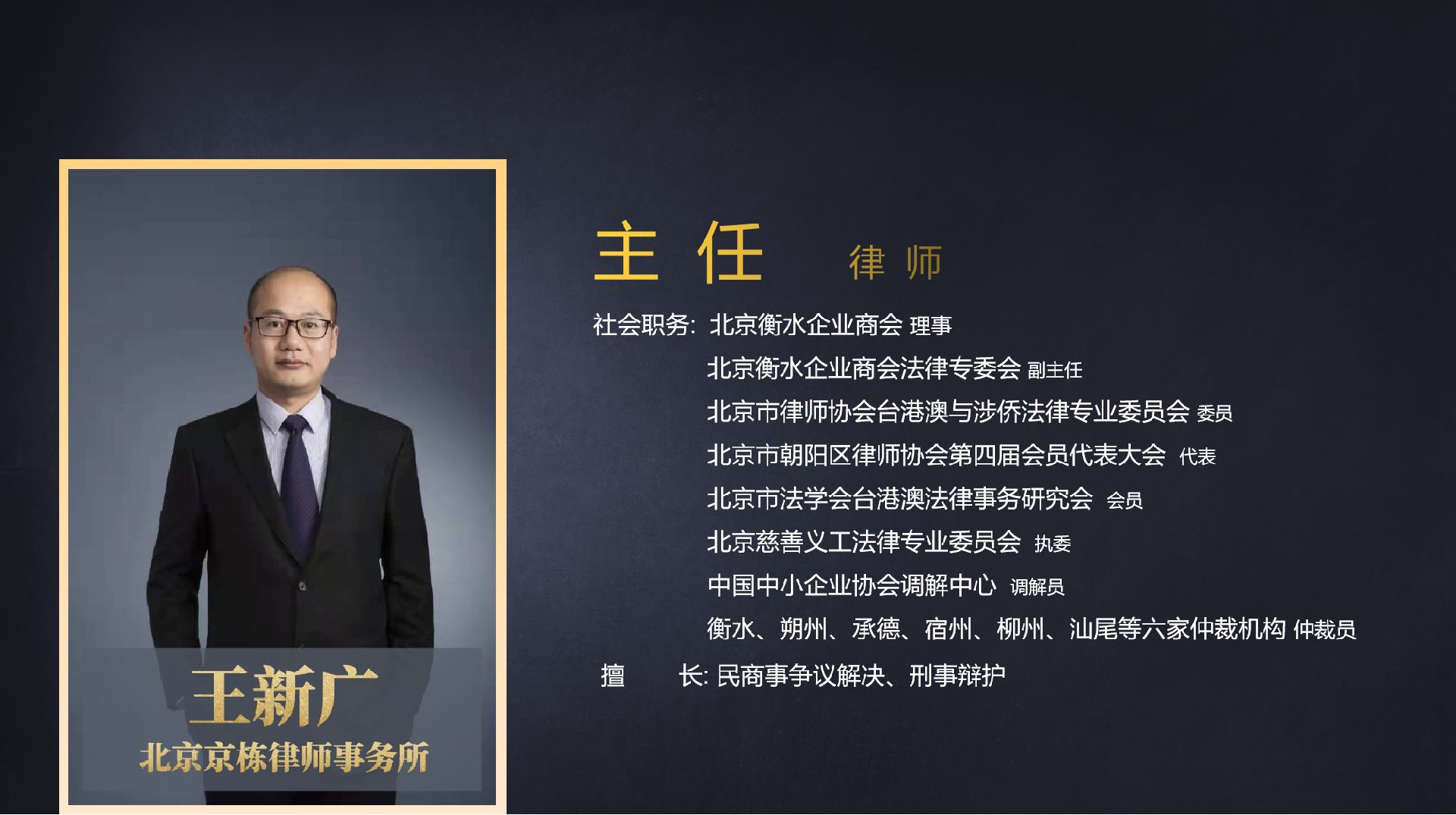 北京京栋律师事务所简介北京京栋律师事务所是一家以民商事诉讼、刑事辩护为核心业务的合伙制综合性律师事务所,业务范围涉及民商事侵权、劳动争议、刑事辩护、房地产和建设工程、行政法律事务与国家赔偿、知识产权、家事纠纷等多个专业领域,致力于为客户提供高质量和全方位的法律服务。北京京栋律师事务所于2021年11月5日成立,坐落于北京东二环CBD商圈,办公环境优雅、宽敞明亮,资源丰富并且拥有强大优秀的律师团队。团队由创始合伙人和多名优秀律师组成,其中执业律师大部分毕业于国内知名院校法学院,他们谙熟法律并具有丰富的法律实务经验,部分曾获得优秀律师称号。2022年北京京栋律师事务所应邀参加第五届全联环境服务业商...